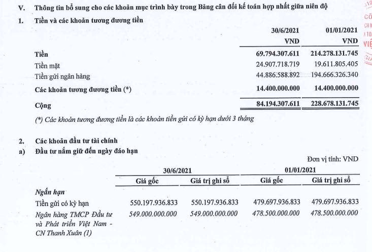 Chẳng hạn tại Công ty CP Tập đoàn CEO (CEO Group - mã: CEO), tại ngày 30/6/2021 ghi nhận tiền và các khoản tương đương tiền giảm mạnh 63% so với đầu năm, chỉ còn 84 tỷ đồng. Thêm vào đó là khoản tiền gửi ngắn hạn còn hơn 550 tỷ đồng.