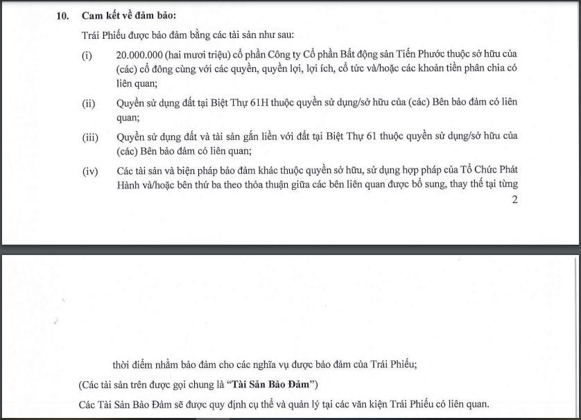 Tài sản đảm bảo gồm 20.000.000 cổ phần Công ty Cổ phần Bất động sản Tiến Phước; Quyền sử dụng đất và công trình xây dựng trên đất tại Biệt Thự 61H và Biệt Thự 61 thuộc quyền sử dụng/sở hữu của (các) Bên bảo đảm có liên quan.