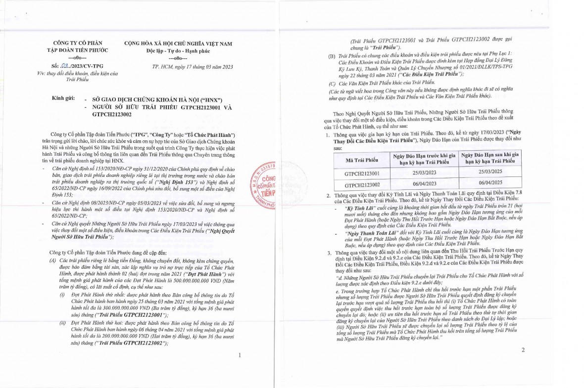 Cụ thể, theo thông tin được công bố trên Sở giao dịch Chứng khoán Hà Nội (HNX), 2 lô trái phiếu của Tiến Phước vừa được trái chủ chấp thuận gia hạn thêm 2 năm có mã GTPCH2123001 và GTPCH2123002. Trong đó, với lô trái phiếu GTPCH2123001 Tiến Phước được chấp thuận gia hạn thời gian thanh toán đến ngày 25/03/2025 (ngày đáo hạn trước khi gia hạn là 25/03/2023). Còn với lô trái phiếu, GTPCH2123002 cũng được gia hạn thê 2 năm, đồng nghĩa việc thời hạn thanh toán được kéo dài đến 06/04/2025 (ngày đáo hạn trước gia hạn là 06/04/2023).
