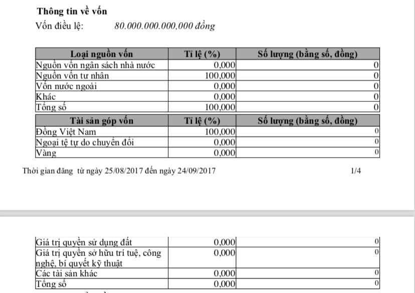 Thời điểm ngày cấp đăng ký thay đổi 25/8/2017, công ty có vốn điều lệ là 120 tỷ đồng. Trong danh sách cổ đông góp vốn đề cập Vũ Thị Hợp góp 79,984 tỷ đồng. Còn hai cổ đông Nguyễn Thị Minh Huệ và Phạm Thị Lạc đã chuyển nhượng hết cổ phần (thời điểm ngày 25/8/2017 đến 24/9/2017).