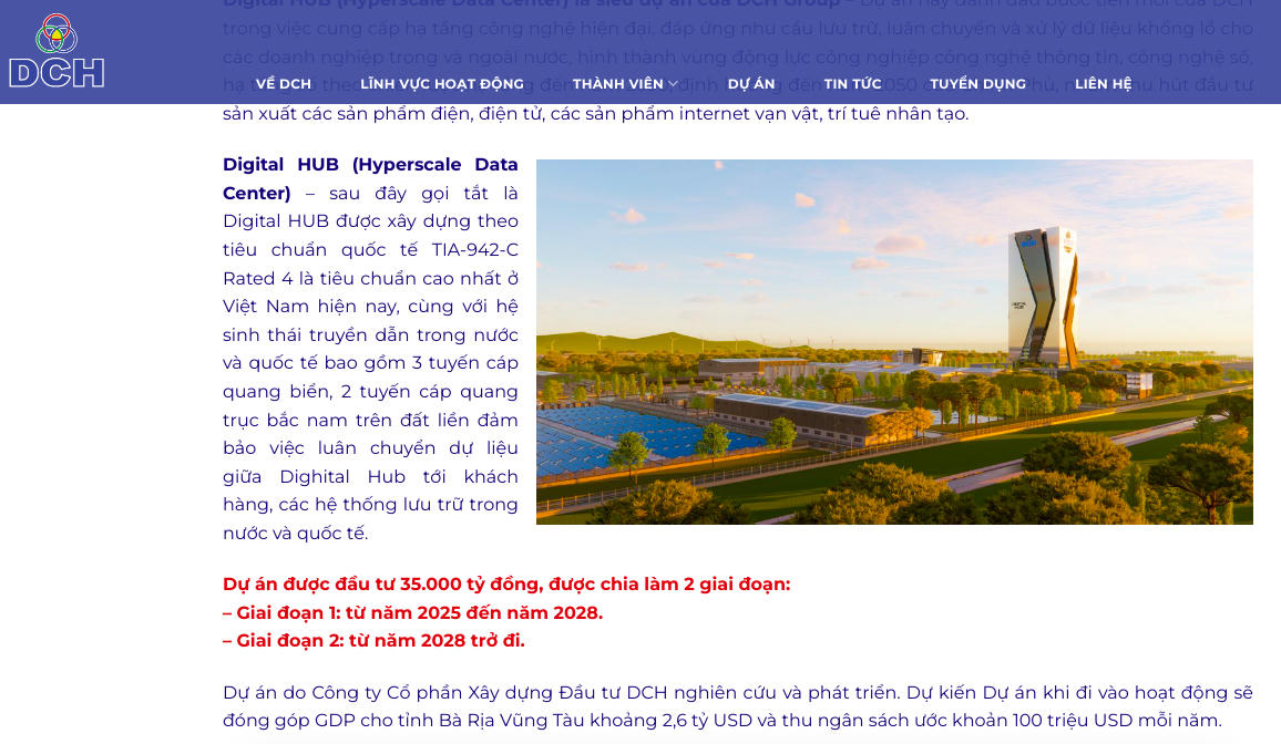 Theo giới thiệu trên website, Digital HUB (Hyperscale Data Center - gọi tắt là Digital HUB), là siêu dự án của DCH Group, dự án này đánh dấu bước tiến mới của DCH trong việc cung cấp hạ tầng công nghệ hiện đại, đáp ứng nhu cầu lưu trữ, luân chuyển và xử lý dữ liệu khổng lồ cho các doanh nghiệp trong và ngoài nước.
