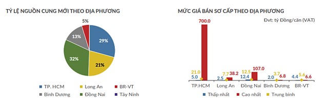 Theo số liệu báo cáo của DKRA Việt Nam về phân khúc nhà phố/biệt thự 6 tháng đầu năm, giá bán sơ cấp tại thị trường TP HCM và các tỉnh giáp ranh như Long An, Đồng Nai, Bình Dương, Bà Rịa – Vũng Tàu có xu hướng ngày càng tăng. Thị trường TP HCM thiết lập mặt bằng giá mới với mức giá bán cao nhất 700 tỷ đồng/căn, Đồng Nai ghi nhận giá bán cao nhất lên đến 107 tỷ đồng/căn.
