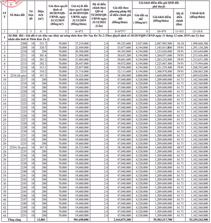 Theo đó, 44 lô đất (diện tích từ 280 - 531,7 m2) tại Dự án Đầu tư cơ sở hạ tầng Khu tái định cư các công trình trên địa bàn TP. Kon Tum kết hợp với mở rộng, phát triển khu dân cư (giai đoạn 1) có giá khởi điểm thấp nhất là 1.209.600.000 đồng và cao nhất là 2.087.985.900 đồng (chưa tính hệ số điều chỉnh).