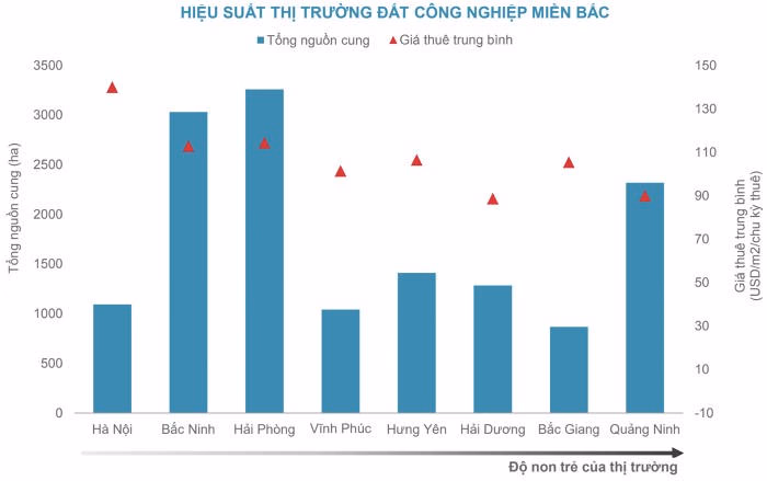 Trong 6 tháng đầu năm nay, nguồn cung đất công nghiệp tại những tỉnh lân cận Hà Nội vẫn còn nhiều, với tỷ lệ lấp đầy trung bình của khu vực vào khoảng 83%. Giá thuê trung bình cho đất công nghiệp ở các tỉnh được ghi nhận vào khoảng 108 USD/m2/chu kỳ thuê.