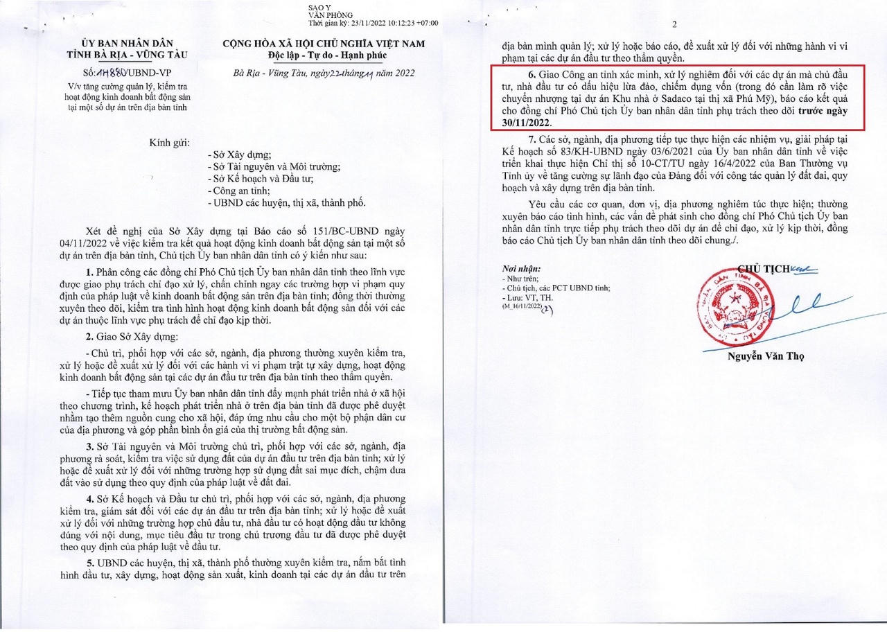 Giao Công an tỉnh xác minh, xử lý nghiêm đối với các dự án mà chủ đầu tư, nhà đầu tư có dấu hiệu lừa đảo, chiếm dụng vốn. Trong đó cần làm rõ việc chuyển nhượng tại dự án Khu nhà ở Sadaco (thị xã Phú Mỹ). Báo cáo kết quả cho Phó chủ tịch phụ trách trước ngày 30/11.
