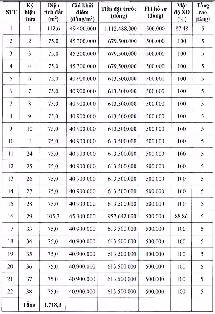 Tổng diện tích là 1.718,3 m2; diện tích các thửa từ 75,5 đến 112,6 m2. Giá khởi điểm 40,9 - 49,4 triệu đồng/m2; trung bình từ 613,5 triệu đồng đến 1,11 tỷ đồng/thửa.