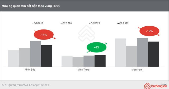 Theo ước tính của Batdongsan.com.vn. trong quý II, đất nền tại miền Bắc và miền Nam có mức độ quan tâm giảm lần lượt là 16% và 12% so với cùng kỳ năm trước. Tuy nhiên, mặt bằng giá rao bán vẫn tăng ở nhiều tỉnh so với trung bình giá năm 2021.