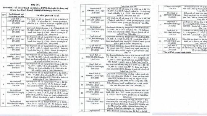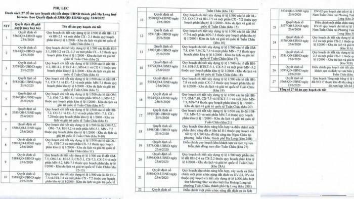 Theo quyết định này, UBND TP Hạ Long (Quảng Ninh) nêu lý do hủy bỏ là 27 đồ án quy hoạch chi tiết được phê duyệt từ tháng 6/2020 nhưng đến nay là 26 tháng mà chưa thực hiện lựa chọn nhà đầu tư, chưa triển khai thực hiện.