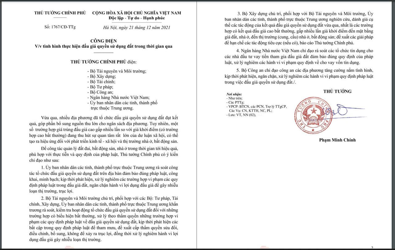 Thủ tướng Chính phủ ban hành Công điện 1767 về tình hình thực hiện đấu giá quyền sử dụng đất trong thời gian qua.