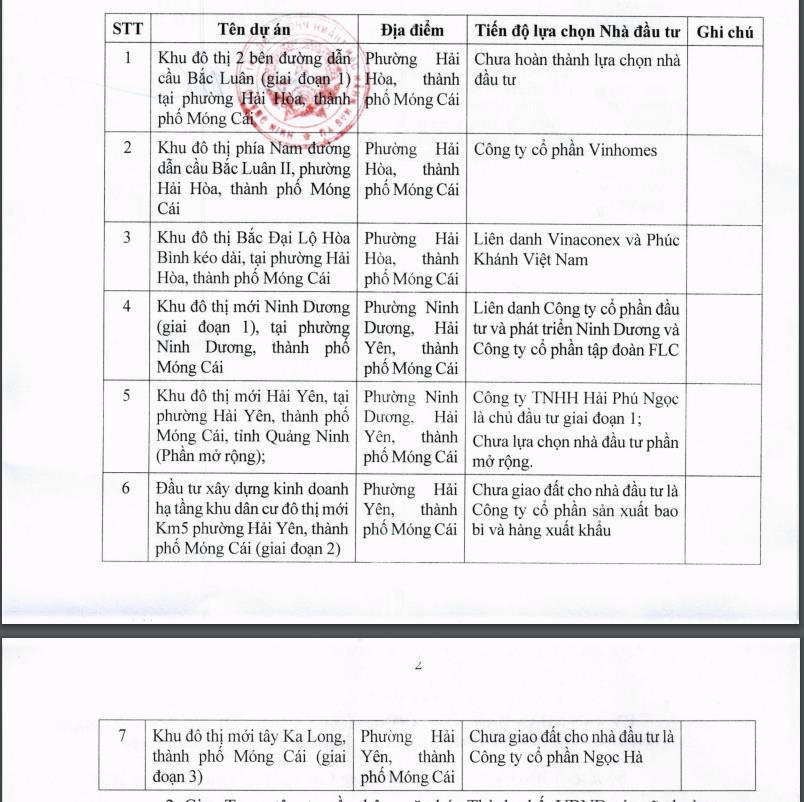 7 dự án này bao gồm: Khu đô thị 2 bên đường dẫn cầu Bắc Luân 2, phường Hải Hòa, TP Móng Cái; Khu đô thị phía nam đường dẫn cầu Bắc Luân 2, phường Hải Hòa (Công ty Cổ phần Vinhomes); Khu đô thị Bắc đại lộ Hòa Bình kéo dài, phường Hải Hòa (Liên danh Vinaconex và Phúc Khánh Việt Nam); Khu đô thị mới Ninh Dương giai đoạn 1, phường Ninh Dương, Hải Yên (Liên danh Công ty Cổ phần đầu tư và phát triển Ninh Dương và Công ty Cổ phần Tập đoàn FLC);