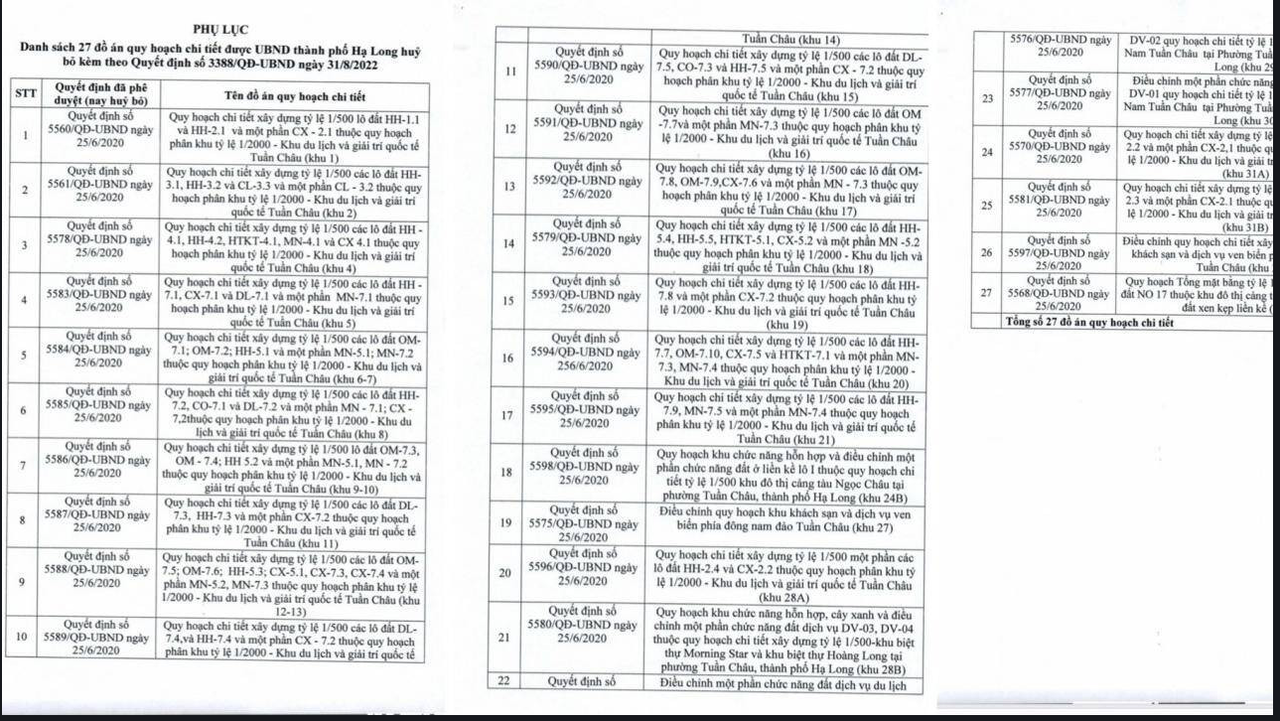 Vừa qua, Chủ tịch UBND TP Hạ Long (tỉnh Quảng Ninh) Nguyễn Tiến Dũng đã ký quyết định hủy bỏ 27 đồ án quy hoạch chi tiết tại phường Tuần Châu, trong đó đa phần đồ án bị hủy là khu du lịch và giải trí quốc tế Tuần Châu.