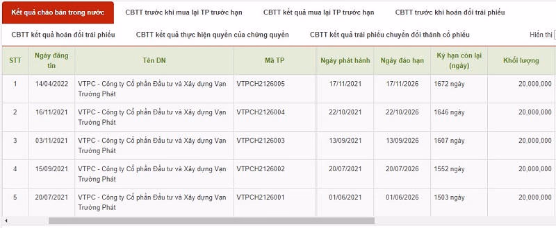 Theo thông tin từ Sở giao dịch Chứng khoán Hà Nội (HNX), CTCP Đầu tư và Xây dựng Vạn Trường Phát vừa thông báo huy động thành công 2.000 tỷ từ kênh trái phiếu. Đây là lô trái phiếu có kỳ hạn 5 năm, được phát hành vào ngày 17/11/2021, đáo hạn vào ngày 17/11/2026 và hoàn tất vào ngày 10/2/2022.