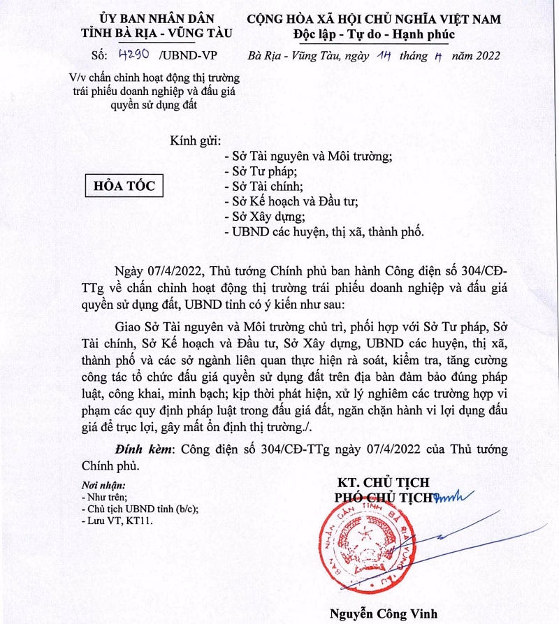 Mới đây, UBND tỉnh Bà Rịa – Vũng Tàu có Công văn hoả tốc số 4290/UBND-VP về việc chấn chỉnh hoạt động thị trường trái phiếu và đấu giá quyền sử dụng đất.