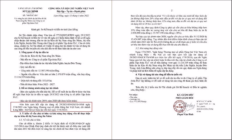 Tại văn bản 749/STC-ĐT được Sở Tài chính tỉnh Lâm đồng ban hành vào ngày 13/4/2022 về năng lực tài chính dự án Khu đô thị Nam sông Đa Nhim của Công ty cổ phần Tập đoàn FLC có nêu rõ, về khả năng huy động vốn thực hiện dự án, ngày 17/6/2021, Ngân hàng Thương mại cổ phần Hàng hải Việt Nam (MSB) chi nhánh Long Biên – Hà Nội có văn bản cam kết cấp tín dụng số 29/2021/034/CKTD-MSB (có hiệu lực đến hết ngày 17/6/2024).