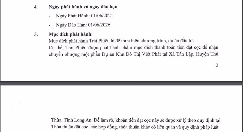 Đáng chú ý, mục đích phát hành của cả 4 đợt phát hành trong năm 2021 của Vạn Trường Phát đều dùng để thanh toán tiền đặt cọc để nhận chuyển nhượng một phần dự án Khu Đô thị Việt Phát.