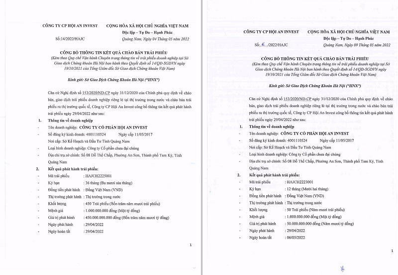 Cụ thể, lô trái phiếu đầu tiên được Hội An Invest phát hành vào ngày 29/4 với mã trái phiếu là HAJCH2225001. Lô trái phiếu có kỳ hạn 36 tháng, đáo hạn vào ngày 29/4/2025. Giá trị của lô trái phiếu này là 450 tỷ đồng.