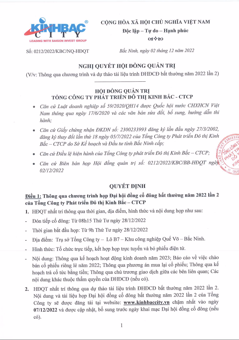 Kinh Bắc (KBC) sắp tổ chức ĐHCĐ bất thường lần 2 năm 2022