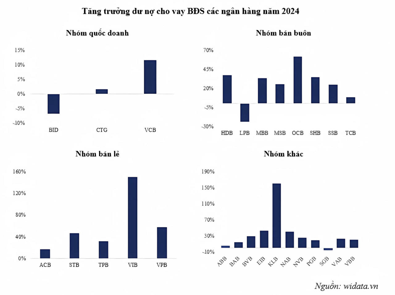 Nhóm ngân hàng quốc doanh, dù chiếm tỷ trọng lớn trong dư nợ cho vay của hệ thống ngân hàng, nhưng lại có mức tăng trưởng tín dụng bất động sản thấp nhất trong năm 2024. Các ngân hàng này vẫn duy trì chính sách cho vay cẩn trọng, đặc biệt đối với các dự án bất động sản có mức rủi ro cao.