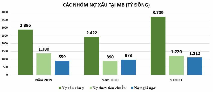 Tại ngày 30/09/2021, tổng nợ xấu tại MB cải thiện hơn so với đầu năm, giảm nhẹ 2%, chỉ còn 3.186 tỷ đồng. Tỷ lệ nợ xấu trên dư nợ vay giảm từ mức 1,09% của đầu năm xuống còn 0,95%. Tuy nhiên, con số này cần được đánh giá cẩn trọng hơn, bởi xét về cơ cấu, nợ có khả năng mất vốn (nợ nhóm 5) của MB giảm 38% xuống còn hơn 853 tỷ đồng nhưng nợ dưới tiêu chuẩn (nợ nhóm 3) lại có xu hướng tăng đáng kể 37% so với đầu năm, lên hơn 1.220 tỷ đồng và nợ nghi ngờ (nợ nhóm 4) tăng 14% lên 1.112 tỷ đồng.