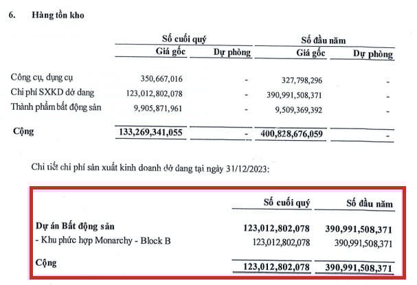 Một công ty bất động sản khác là Công ty Đầu tư Phát triển Nhà Đà Nẵng cũng ghi nhận doanh thu từ việc chuyển nhượng căn hộ dự án Monarchy - Block B. Được biết, dự án này đã giảm tồn kho từ 390,99 tỷ đồng xuống còn 123 tỷ đồng.