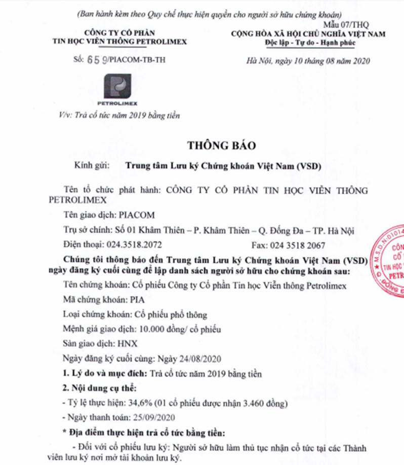Tin học Viễn thông Petrolimex (PIA) trả cổ tức năm 2019 bằng tiền mặt tỷ lệ 34.6%