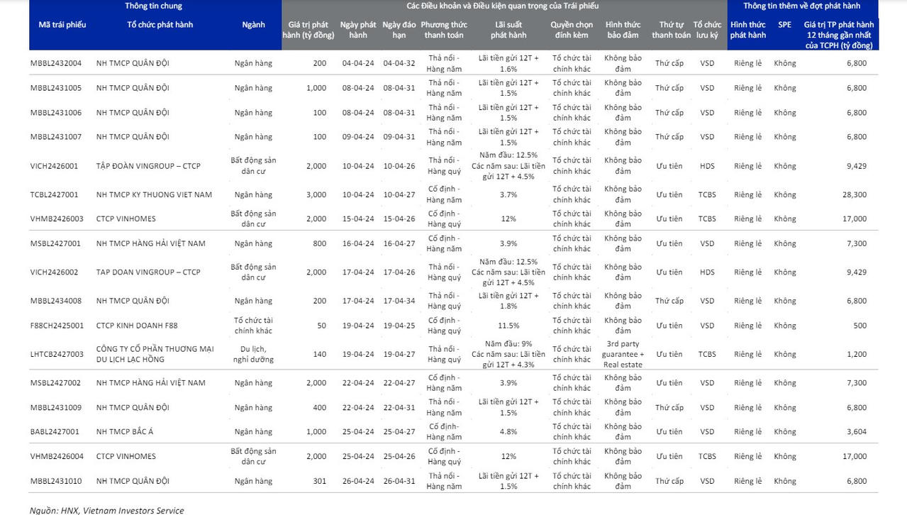 Trong số những lô TPDN mới phát hành trong tháng 4/2024, hầu hết đều không có tài sản đảm bảo. Số ít còn lại có bảo lãnh của bên thứ 3 và có tài sản đảm bảo là bất động sản.