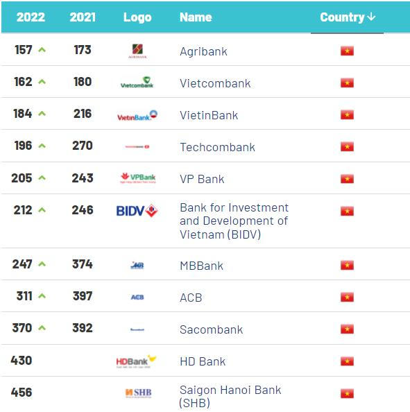 Việt Nam có 11 ngân hàng lọt bảng xếp hạng 500 ngân hàng giá trị thương hiệu cao nhất toàn cầu gồm Agribank, Vietcombank, VietinBank, Techcombank, VPBank, BIDV, MB, ACB, Sacombank, riêng HDBank và SHB là hai ngân hàng mới lọt vào top 500.