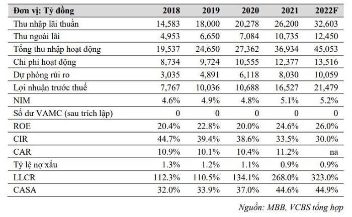 Cụ thể, báo cáo cập nhật Ngân hàng TMCP Quân đội (MB, Mã: MBB), Công ty Chứng khoán Vietcombank (VCBS) dự báo rằng lợi nhuận trước thuế năm 2022 của MB đạt 21.479 tỷ đồng, tăng 30% so với năm 2021.