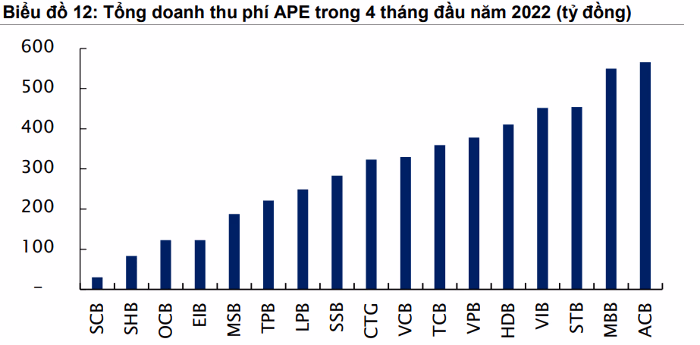 Theo báo cáo cập nhật ngành ngân hàng mới đây, CTCP Chứng khoán Yuanta Việt Nam cho biết Ngân hàng Á Châu (ACB) đã vươn lên và xếp vị trí thứ nhất về doanh thu phí bảo hiểm (APE) 4 tháng đầu năm với tổng phí APE là 565 tỷ đồng. Trong năm 2021, ngân hàng đứng thứ 5 xét về doanh thu phí bảo hiểm khoảng 1.300 tỷ đồng.