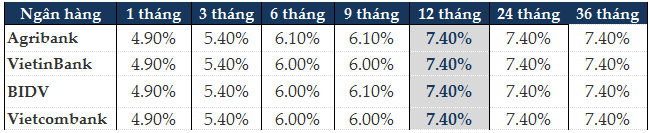 Cụ thể, ngày 27/10 vừa qua, ba ngân hàng TMCP Nhà nước BIDV, VietinBank và Agribank đã điều chỉnh tăng lãi suất huy động thêm hơn 1 điểm % tại hầu hết kỳ hạn. Mức lãi suất cao nhất tại các ngân hàng này là 7,4%/năm, áp dụng cho hình thức gửi tại quầy ở các kỳ hạn từ 12 tháng trở lên, tăng thêm 1 điểm % so với trước đó.