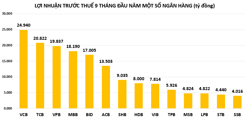 Theo đó, Lợi nhuận trước thuế 9 tháng của Vietcombank đạt gần 24.940 tỷ đồng, tăng gần 30% so với cùng kỳ. Với con số này, Vietcombank tiếp tục giữ vững vị trí quán quân toàn ngành về lợi nhuận.