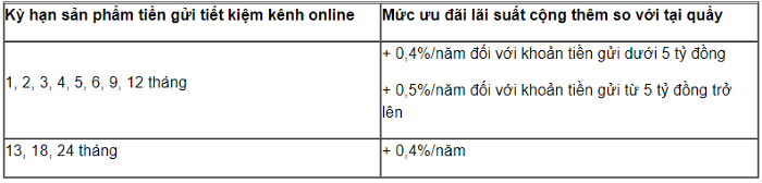 Cụ thể, tại kỳ hạn từ 1 tháng đến 6 tháng, 9 tháng và 12 tháng, khách hàng sẽ được cộng thêm 0,4%/năm đối với khoản tiền gửi dưới 5 tỷ đồng và 0,5%/năm đối với khoản tiền gửi từ 5 tỷ đồng trở lên. Với các kỳ hạn dài hơn 13, 18, 24 tháng, khách hàng sẽ được cộng thêm 0,4%/năm so với gửi tại quầy, không yêu cầu số tiền gửi.