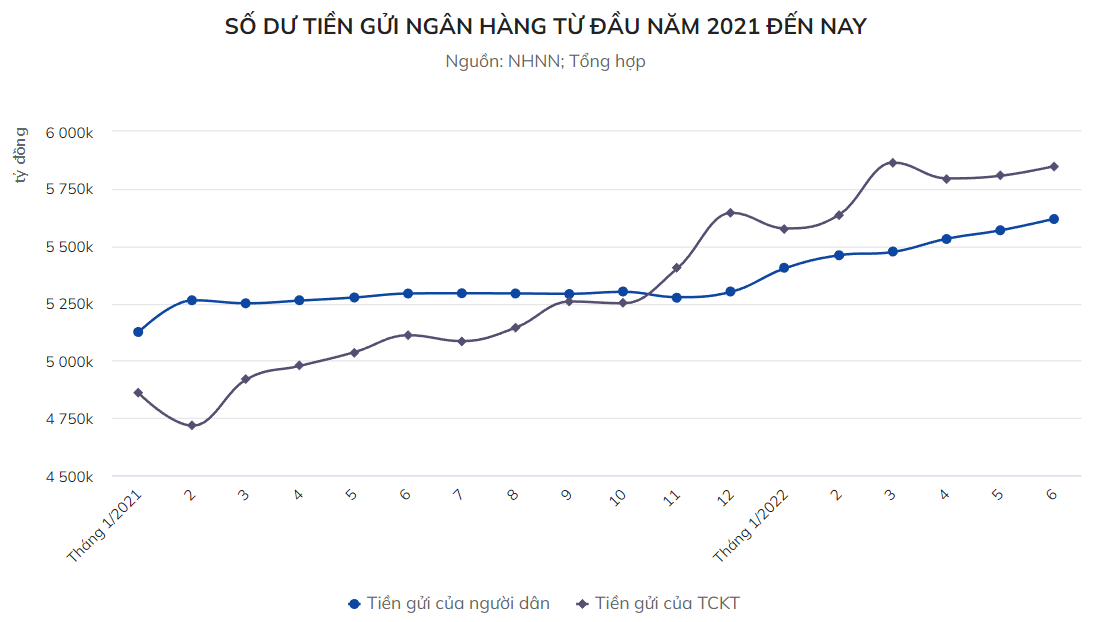 Số liệu mới nhất từ NHNN, tính từ đầu năm đến nay, người dân đã mang tổng cộng gần 319.000 tỷ đồng gửi thêm vào hệ thống ngân hàng, tăng 6,02% so với đầu năm. Mức tăng số dư tiền gửi 6 tháng đầu năm nay đã cao hơn gấp đôi so với cùng kỳ năm 2021 và cao hơn 30% so với năm 2020.