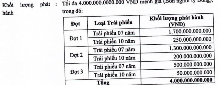 Ngân hàng dự kiến phát hành trái phiếu thành ba đợt. Đợt 1, ngân hàng phát hành 1.700 tỷ đồng trái phiếu 7 năm và 250 tỷ đồng trái phiếu 10 năm. Đợt 2, ngân hàng phát hành 1.300 tỷ đồng trái phiếu 7 năm và 200 tỷ đồng trái phiếu 10 năm. Đợt 3, ngân hàng phát hành 500 tỷ đồng trái phiếu 7 năm và 50 tỷ đồng trái phiếu 10 năm.
