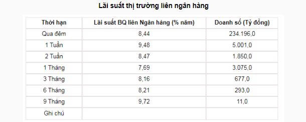 Theo số liệu được NHNN cập nhật, phiên giao dịch 5/10 lãi suất VND bình quân liên ngân hàng kỳ hạn qua đêm (kỳ hạn chính chiếm 80 - 90% tổng khối lượng giao dịch) tăng lên 8,44%/năm - mức cao nhất trong hơn 10 năm qua. So với phiên 04/10 (7,88%), mức lãi suất qua đêm này đã tăng 0,56 điểm phần trăm. Phiên 03/10, mức lãi suất này chỉ đạt 5,26%.