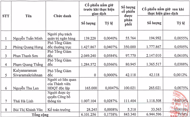 8 cá nhân là các phó tổng giám đốc, kế toán trưởng, người phụ trách quản trị ngân hàng... đăng ký mua 843.340 cổ phiếu ESOP. Thời gian thực hiện các giao dịch dự kiến từ ngày 12-26/8.