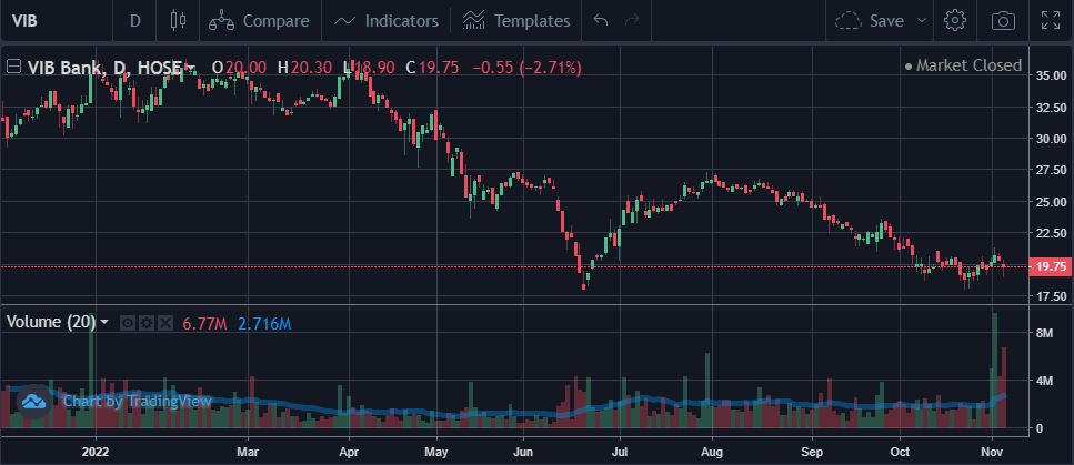 Ước tính với mức giá trung bình trong giai đoạn từ 4/10-2/11 là 19.940 đồng/cp, số cổ phần giao dịch của ông Thụ và bà Giang có giá trị xấp xỉ gần 79,6 tỷ đồng. Trên thị trường chứng khoán, kết phiên 3/11, giá cổ phiếu VIB dừng ở 19.900 đồng/cp, giảm hơn 44% so với đầu năm.