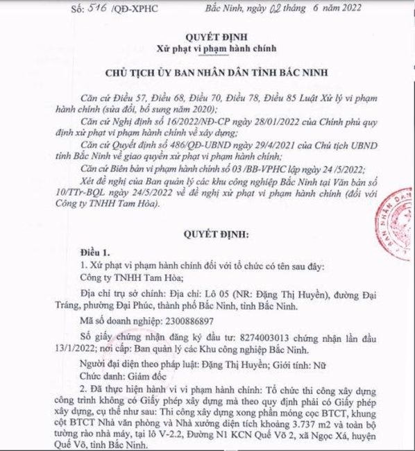 Theo Quyết định số 516/QĐ-XPHC ngày 2/6/2022, Công ty TNHH Tam Hòa, địa chỉ tại phường Đại Phúc, TP Bắc Ninh đã xây dựng phần móng cọc BTCT, khung cột BTCT Nhà văn phòng, nhà xưởng diện tích khoảng 3.737 mét vuông và toàn bộ tường rào nhà máy, tại lô V-2.2, Đường N1 KCN Quế Võ 2, xã Ngọc Xá, huyện Quế Võ, tỉnh Bắc Ninh.