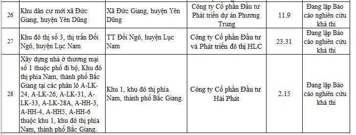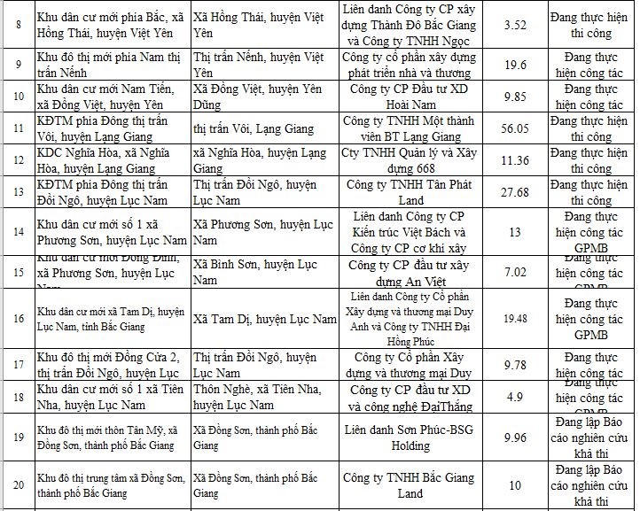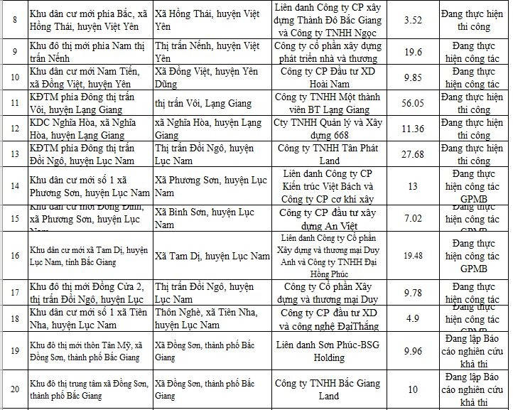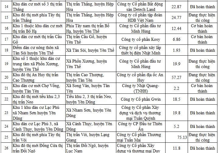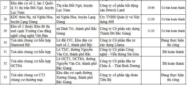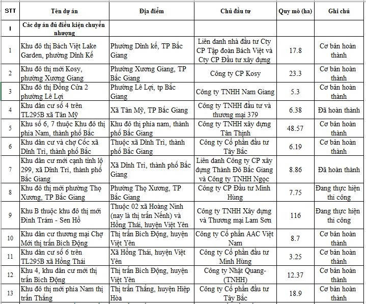 Sở Xây dựng tỉnh Bắc Giang mới đây đã công bố thông tin thống kê các dự án nhà ở, khu đô thị, khu dân cư mới đang thực hiện đầu tư trên địa bàn tỉnh. Trong danh sách thống kê cập nhật đến ngày 27/7, có 33 dự án đủ điều kiện chuyển nhượng, 28 dự án chưa đủ điều kiện chuyển nhượng.