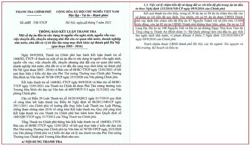 theo kết luận, trong số 38 dự án kiểm tra, có 4 dự án chậm đưa đất vào sử dụng so với tiến độ gồm: Dự án tại 47 Nguyễn Tuân, Dự án 31 Láng Hạ, dự án 108 Nguyễn Trãi và dự án tại đường Ngụy Như Kon Tum do do Tổng công ty Thành An (Binh đoàn 11- Bộ Quốc phòng) làm chủ đầu tư. Trong đó Thanh tra Chính phủ thông tin chỉ có dự án tại 47 Nguyễn Tuân do Công ty CP Bất động sản Mùa Đông-VID làm chủ đầu tư và Công ty Phát triển BĐS TNR Holdings Việt Nam làm đơn vị quản lý và phát triển dự án là được UBND TP Hà Nội xác định tiền chậm tiến độ là 13 tỷ đồng. Ba dự án còn lại không được UBND TP Hà Nội thực hiện.