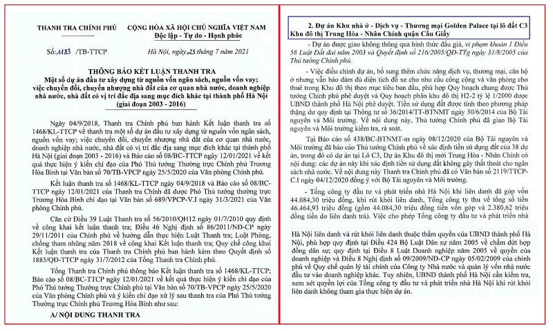 Về việc giao đất không qua đấu giá, Thanh tra Chính phủ lấy ví dụ điển hình là Dự án tại lô đất C3 là một phần dự án khu đô thị Trung Hòa Nhân Chính (có tên gọi khác là Golden Palace).