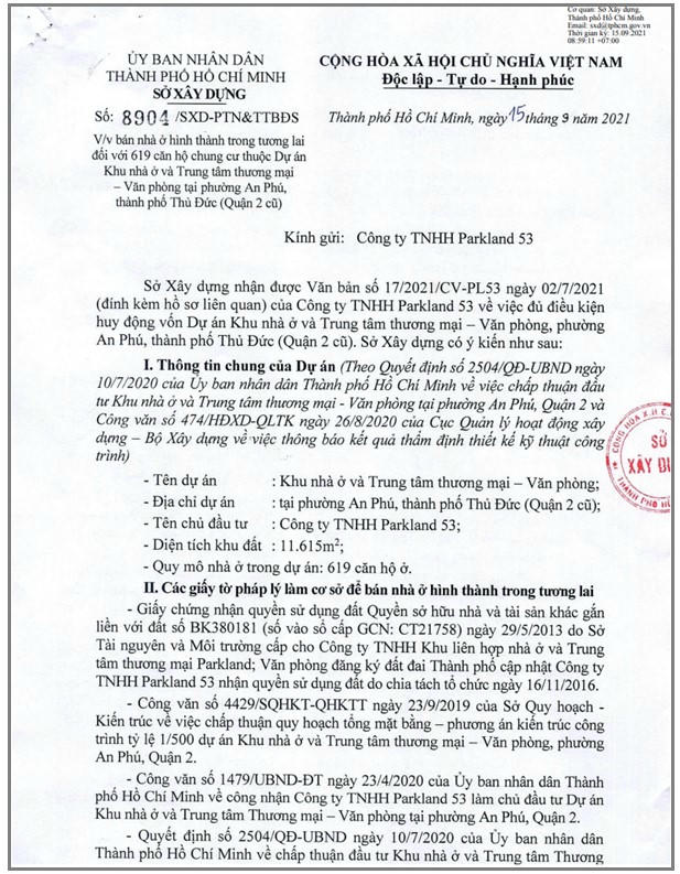 Vừa qua, Sở Xây dựng TP Hồ Chí Minh đã có văn bản cho phép bán nhà ở hình thành trong tương lai đối với 619 căn hộ thuộc dự án Khu nhà ở và trung tâm thương mại – văn phòng (phường An Phú, TP Thủ Đức) do Parkland 53 làm chủ đầu tư.