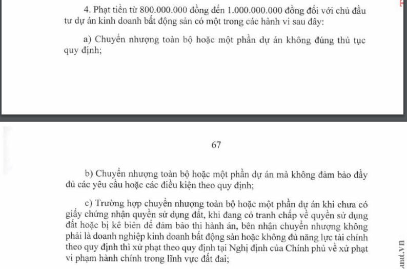 Theo đó, phạt tiền từ 800 triệu đồng đến 1 tỷ đồng đối với chủ đầu tư dự án kinh doanh bất động sản có một trong các hành vi sau đây: Chuyển nhượng toàn bộ hoặc một phần dự án không đúng thủ tục quy định; Chuyển nhượng toàn bộ hoặc một phần dự án mà không đảm bảo đầy đủ các yêu cầu hoặc các điều kiện theo quy định;