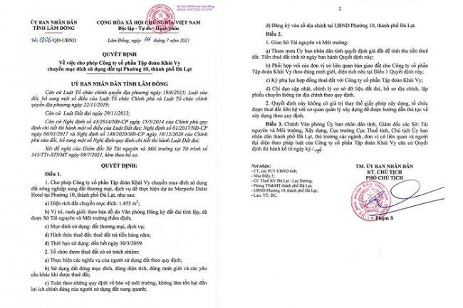 Cụ thể, theo văn bản được ban hành có gần 1.500 m2 đất nông nghiệp sẽ được chuyển mục đích để doanh nghiệp thực hiện dự án Merperle Dalat Hotel tại phường 10, TP Đà Lạt. Doanh nghiệp sẽ thuê đất trả tiền hàng năm, thời hạn sử dụng đến 30/3/2059.