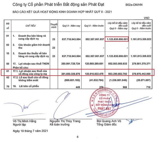 Tính riêng Quý 2 năm nay, Phát Đạt ghi nhận lãi ròng gần 252 tỷ đồng (tăng 8% so với cùng kỳ). Còn lũy kế 6 tháng đầu năm Phát Đạt đạt gần 1.124 tỷ đồng doanh thu thuần và hơn 503 tỷ đồng lãi ròng, giảm 5% về doanh thu nhưng tăng hơn 80% về lợi nhuận so với cùng kỳ năm ngoái.