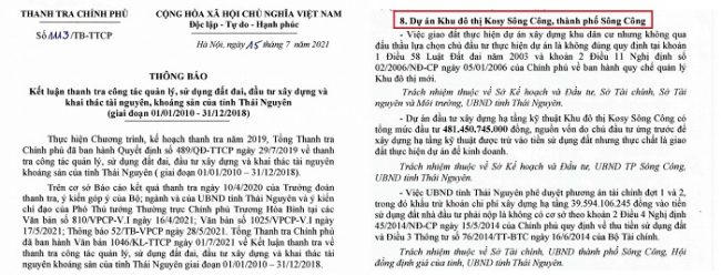 Phía Thanh tra Chính phủ cũng cho biết, trách nhiệm thuộc về Sở Kế hoạch và Đầu tư, Sở Tài chính, Sở Tài nguyên và Môi trường, UBND tỉnh Thái Nguyên. “Trách nhiệm thuộc về Sở Kế hoạch và Đầu tư, UBND TP.Sông Công, UBND tỉnh Thái Nguyên”, kết luận của Thanh Tra Chính phủ chỉ rõ.