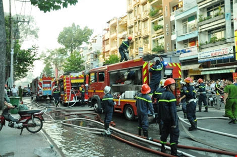 Lực lượng CSPCCC quận 1 điều động điều nhiều xe thang, xe nước đến hiện trường khống chế ngọn lửa; điện được cắt, tuyến đường Lê Hồng Phong được phong tỏa để đảm bảo an toàn. Lính cứu hỏa mặc bảo hộ, mặt nạ phòng độc tìm điểm hỏa dập lửa.