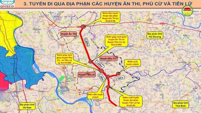 - Đầu tư tuyến chính gồm 2 đường song hành với quy mô đường III đồng bằng, tốc độ thiết kế 80km/h, có điểm đầu Km0+00 tại xã Tân Phúc (huyện n thi) và điểm cuối tại Km23+600 giao đường tỉnh 378 thuộc địa phận xã Tống Trân (huyện Phù Cừ).