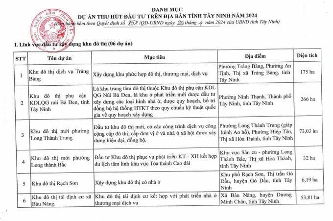 UBND tỉnh Tây Ninh mới đây đã ban hành Quyết định số 857/QĐ-UBND ngày 26/4/2024 về Danh mục dự án thu hút đầu tư trên địa bàn tỉnh năm 2024. Bao gồm: Lĩnh vực đầu tư xây dựng khu đô thị 6 dự án; Lĩnh vực đầu tư xây dựng nhà ở 15 dự án; Lĩnh vực Khu thương mại dịch vụ và chợ 10 dự án; Lĩnh vực Giao thông Vận tải 1 dự án; Lĩnh vực Kho bãi xuất nhập khẩu hàng hoá 2 dự án; Lĩnh vực du lịch 3 dự án và các lĩnh vực y tế, giáo dục... khác.