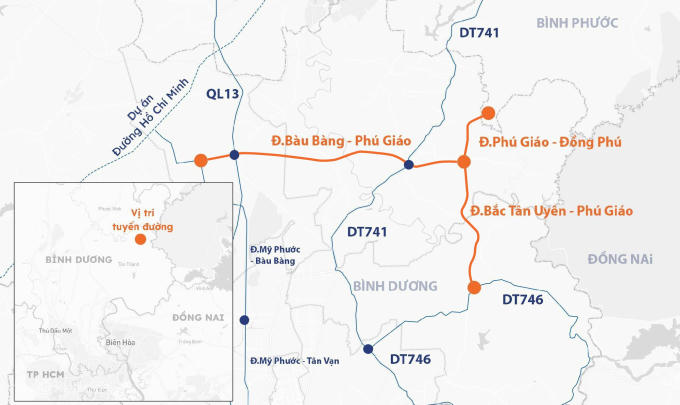 Đoạn từ Tân Thành đến cầu Tam Lập dài khoảng 10km, do Ủy ban Nhân dân huyện Bắc Tân Uyên làm chủ đầu tư.Đoạn từ cầu Tam Lập đến Đồng Phú dài khoảng 13km và từ ngã ba Tam Lập đến Bàu Bàng dài khoảng 18km, do Ủy ban Nhân dân huyện Phú Giáo làm chủ đầu tư.Đoạn Tân Long - Lai Uyên dài khoảng 9km, do Ủy ban Nhân dân huyện Bàu Bàng làm chủ đầu tư.Tổng mức đầu tư cho dự án là hơn 5.256 tỷ đồng, trong đó chi phí xây dựng hơn 3.067 tỷ đồng và chi phí đền bù, giải phóng mặt bằng là 1.531 tỷ đồng.